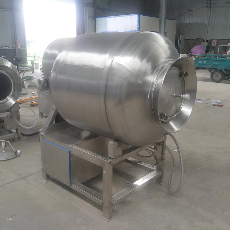 真空滾揉機通過模擬人工揉搓動作,在真空環境下對原料肉進行物理處理。設備運行時,滾筒緩慢旋轉,肉塊在離心力作用下不斷上升、跌落,相互碰(pèng)撞、摩擦(cā)。真空環境不僅有效抑(yì)製了微(wēi)生物(wù)繁殖,還促使肉纖維鬆弛,使(shǐ)醃漬料更快滲透到肉質深層。這種物理作用使肉蛋白析出,形成乳化層,終改善產品的保水性、嫩度和切片性。