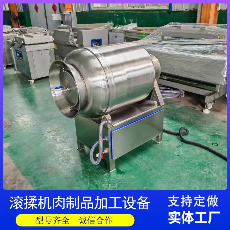 在設備構造方麵,級真空滾揉機采用全304不鏽鋼材質。這種材(cái)料不僅符合食品安全標準,還具有優異的(de)強度和耐腐蝕性,能夠適應高鹽、高濕的加工環境。滾筒內部通常采用鏡麵拋光處(chù)理,表(biǎo)麵(miàn)粗糙度低,既有利於物料流動,也便於清潔(jié)。真空係統(tǒng)配備高精度傳(chuán)感器和多重密封裝置,確保在長時(shí)間運行中維持穩定的真(zhēn)空環境。