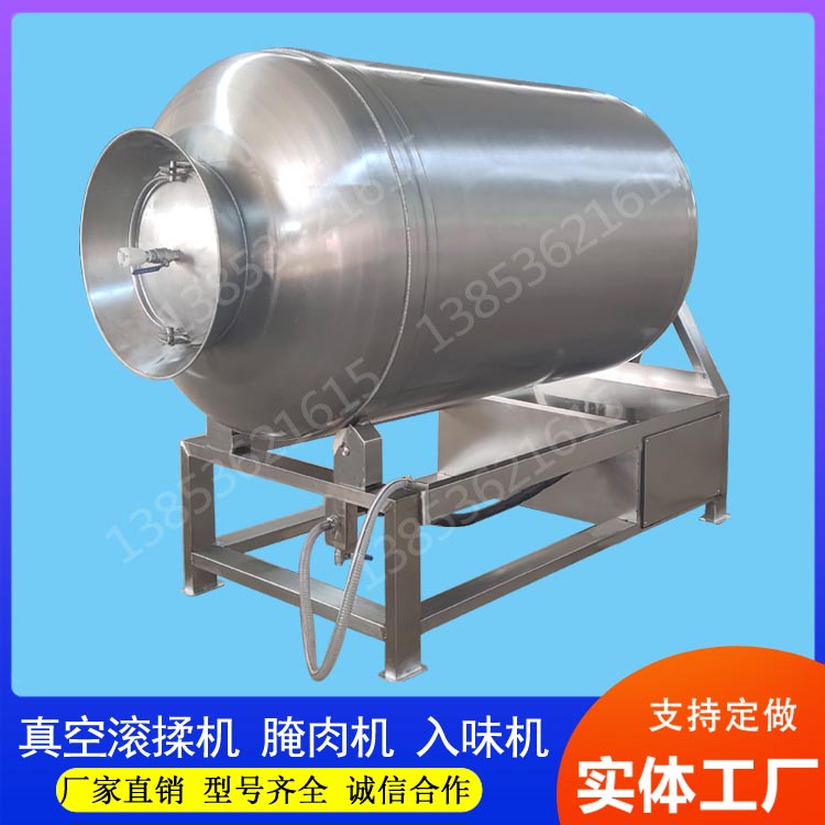 真空滾揉機是在真空狀態下,利用物理衝擊原理,讓肉(ròu)塊或肉餡在滾筒內上下翻動,從而達到按摩、醃漬作(zuò)用。醃漬液被(bèi)肉充(chōng)分地吸收,增強肉的結合力和保水性,提高(gāo)產品彈性及出(chū)品率。本機采用不鏽鋼製作,結構合理,運行平衡、噪(zào)音小、性能可靠、操(cāo)作簡便、設備使用效(xiào)率高(gāo)。